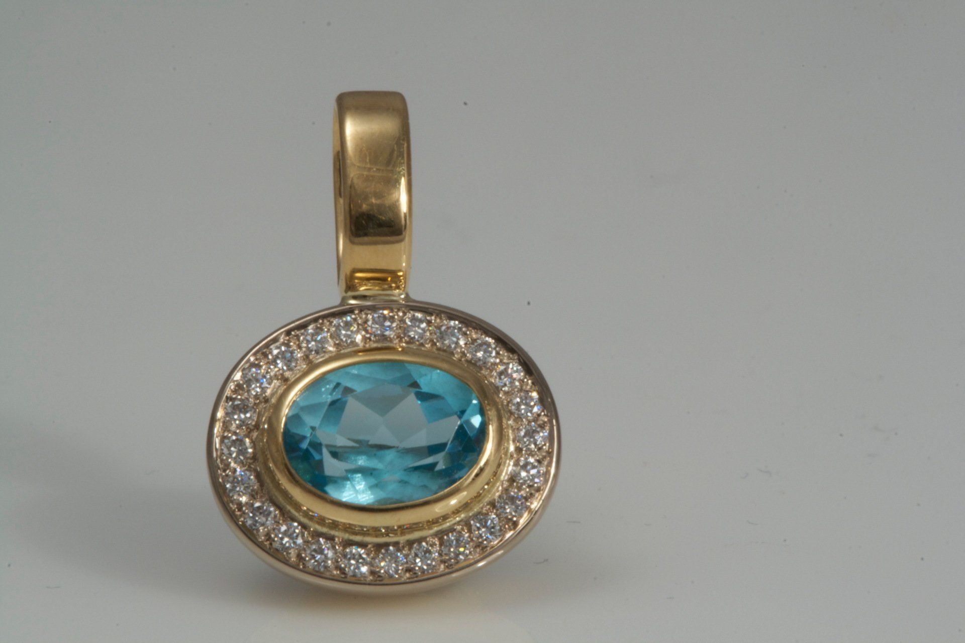 Hanger in 18 krt geelgoud met blauwe topaas en brillanten pavé gezet