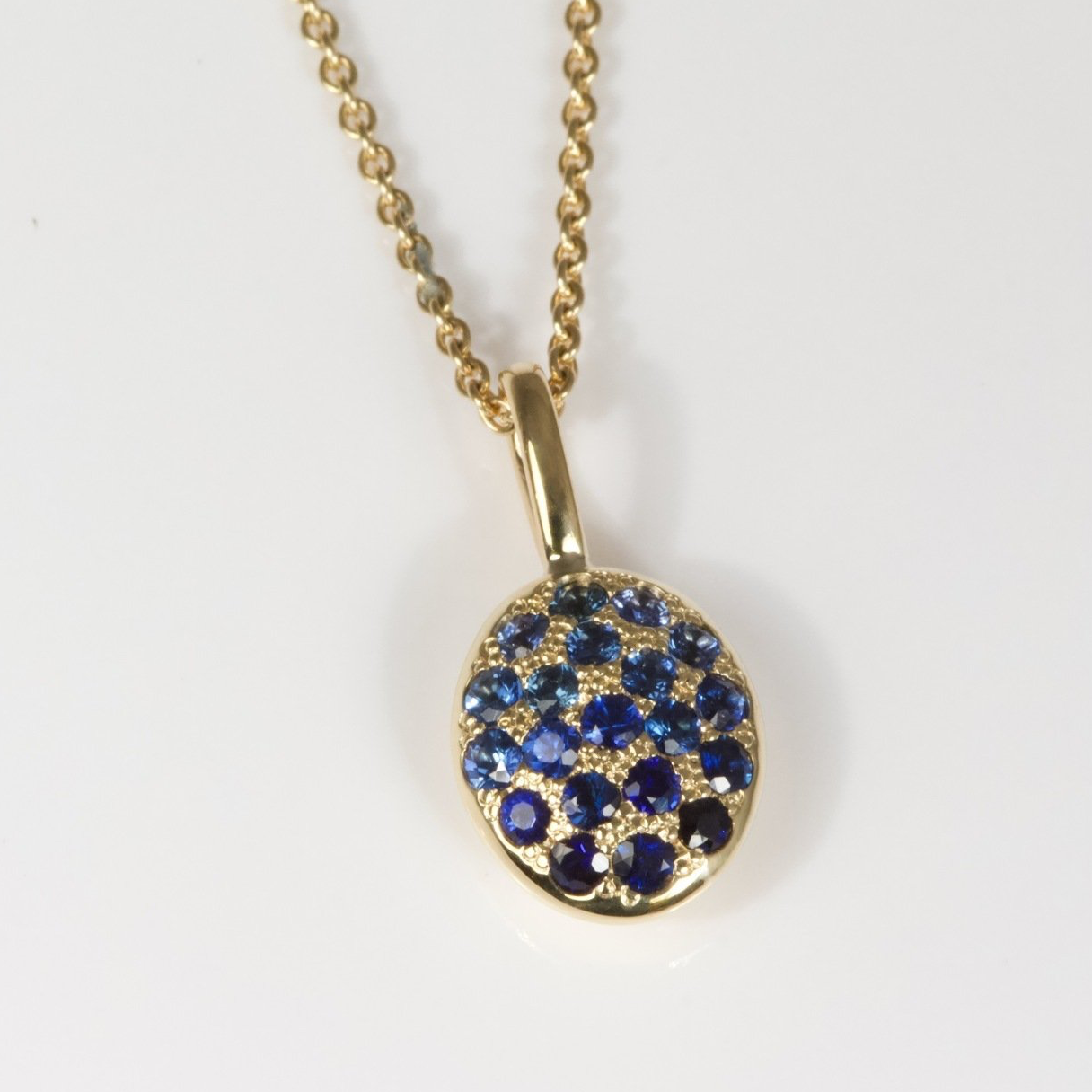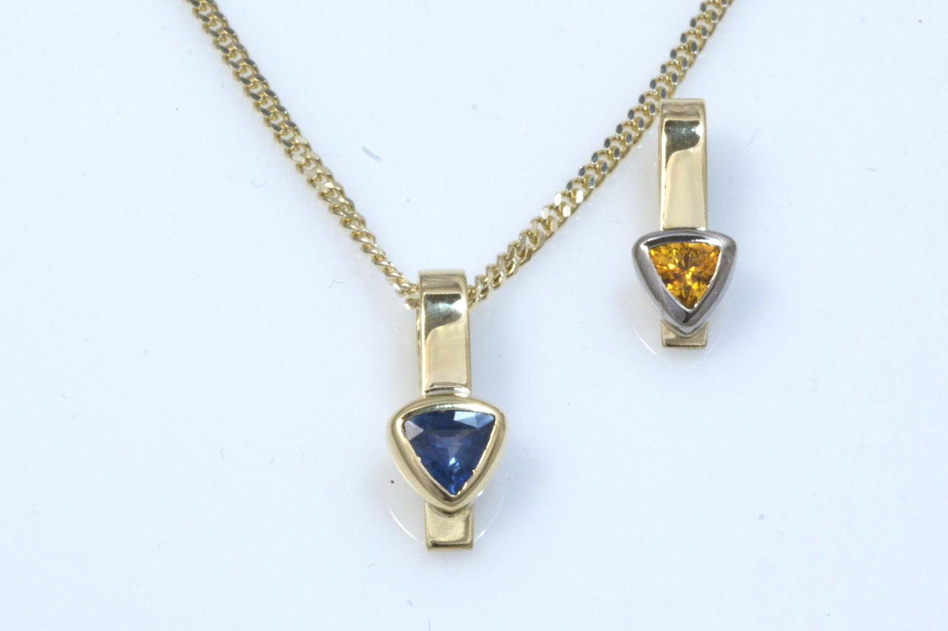 Hanger in 18 krt geelgoud met blauwe saffier trillant geslepen.