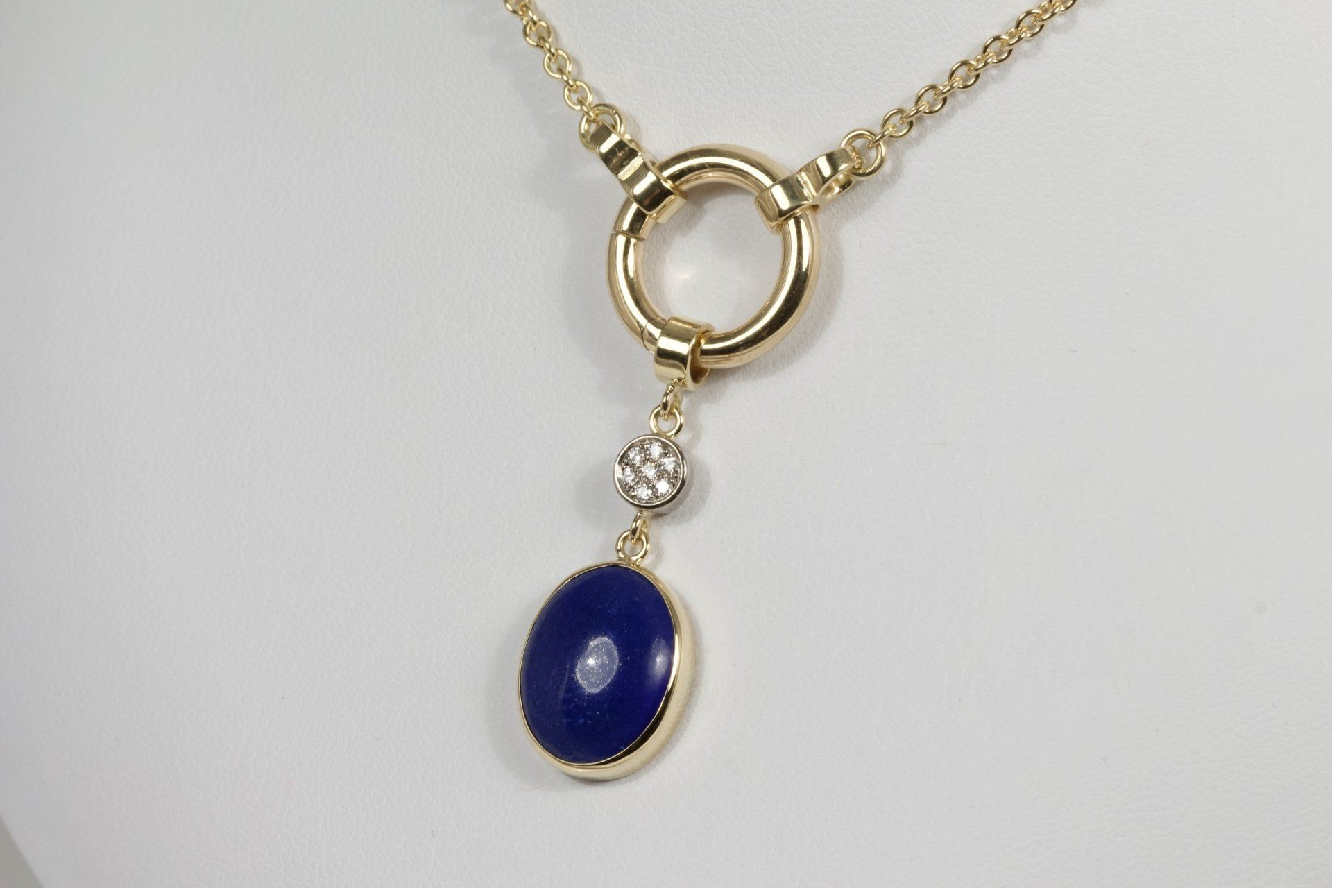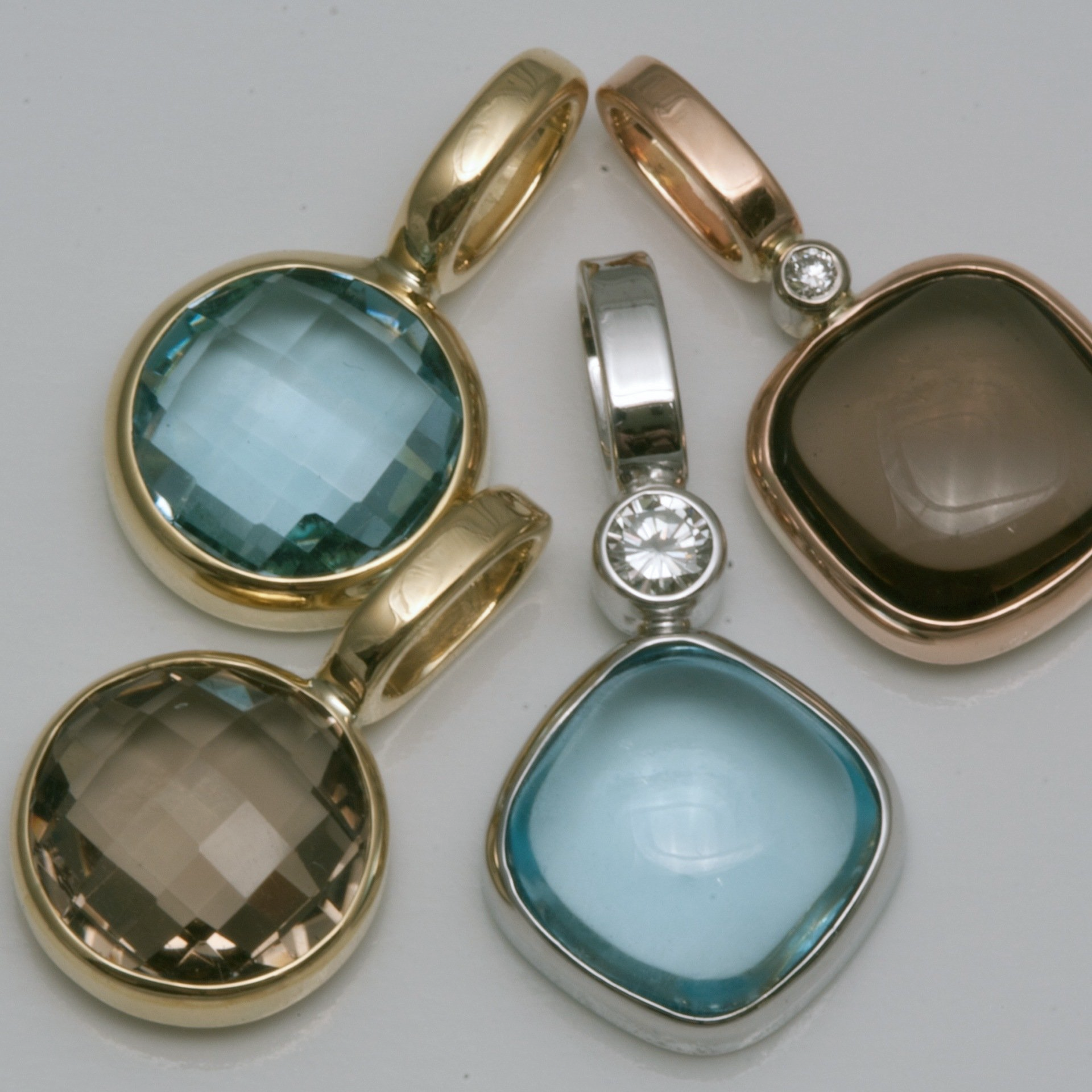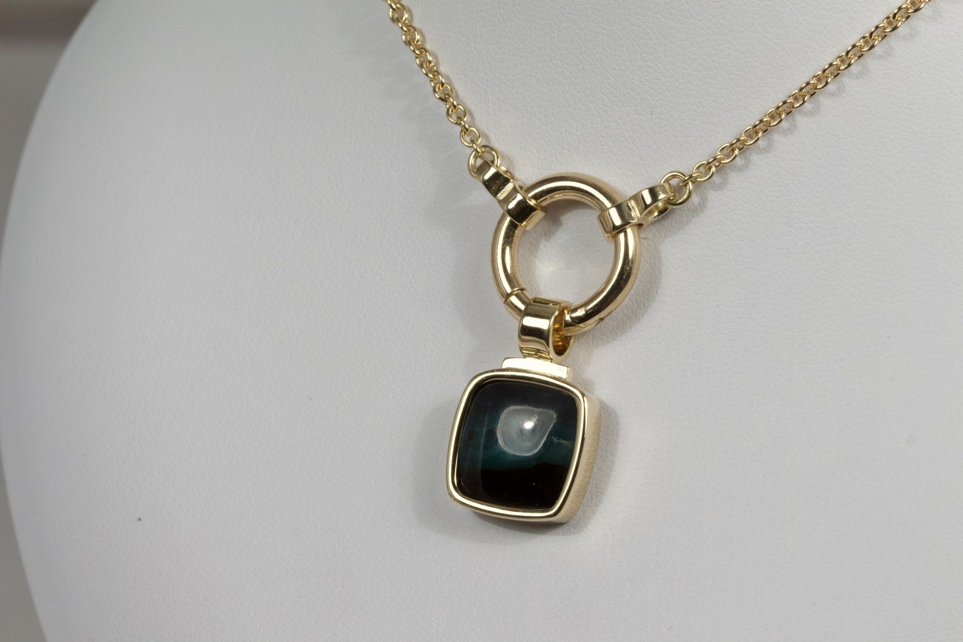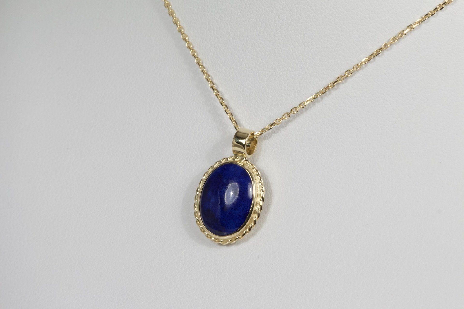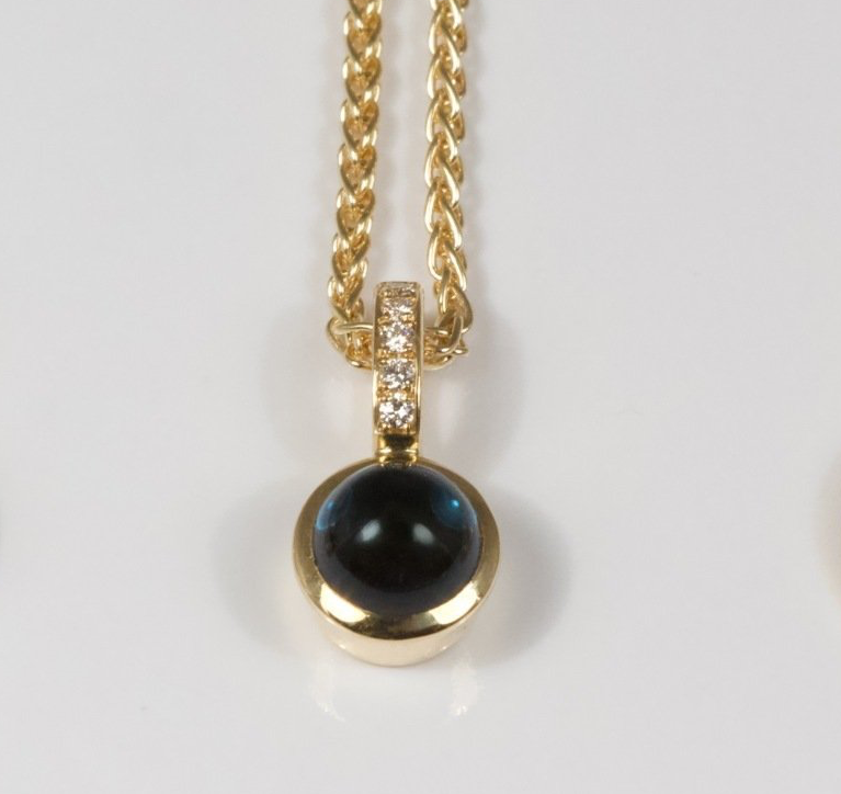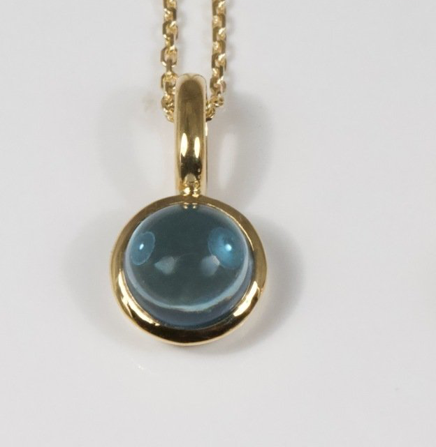 Hanger in 18 krt geelgoud met cabochon geslepen blauwe topaas London.