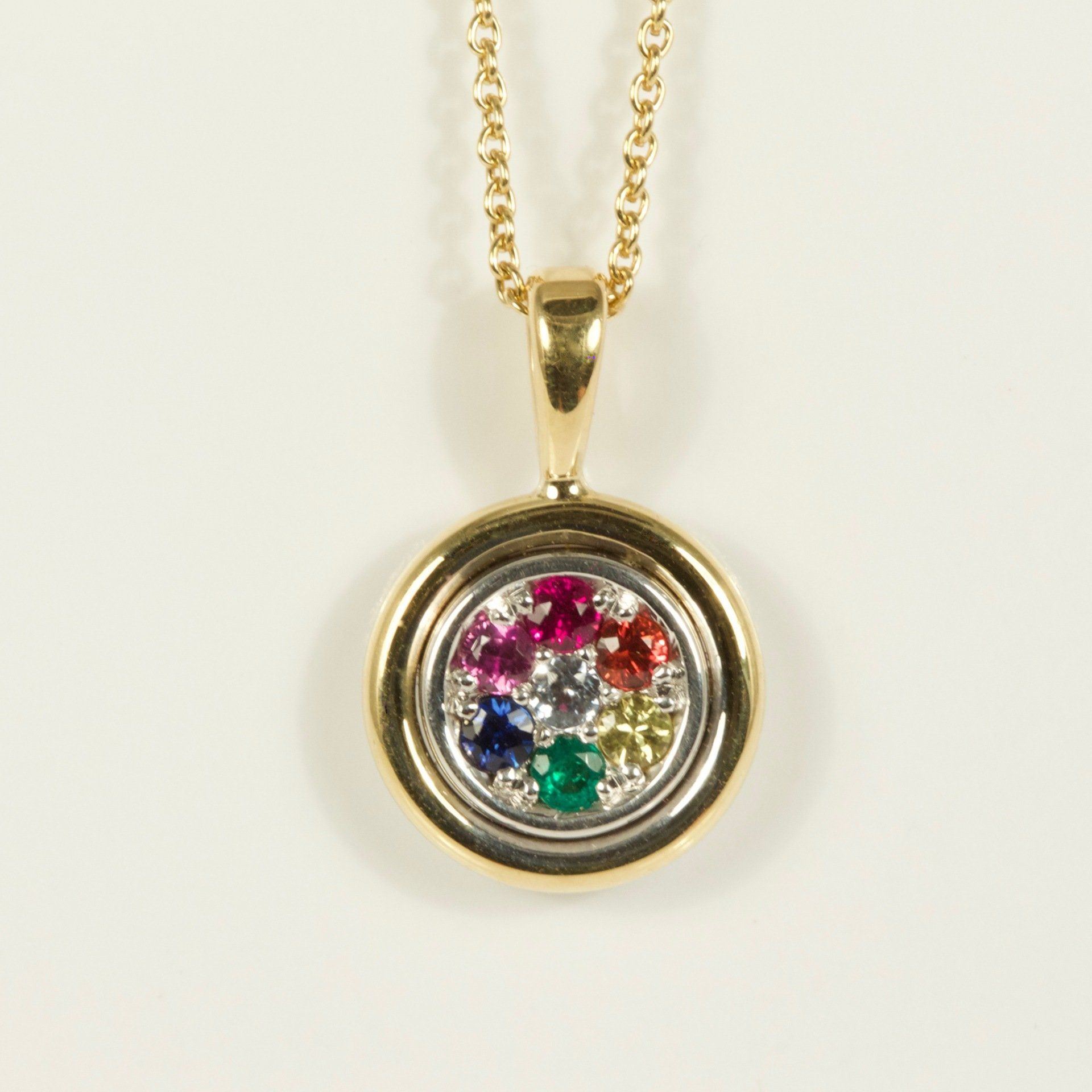 Hanger in 18 krt wit- en geelgoud met vijf kleuren saffier, robijn en smaragd pavé gezet