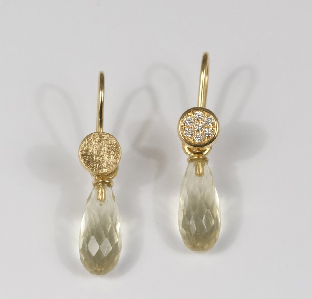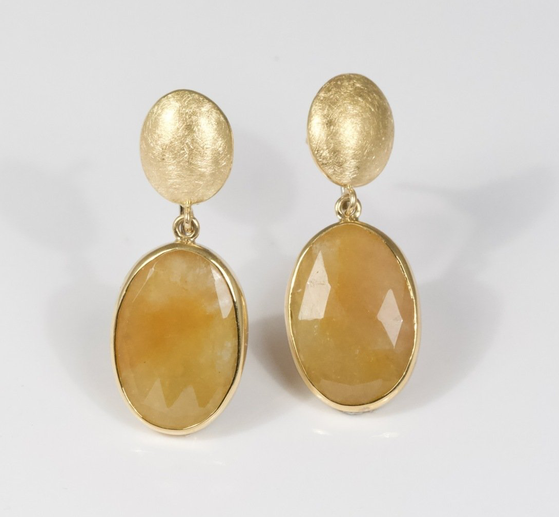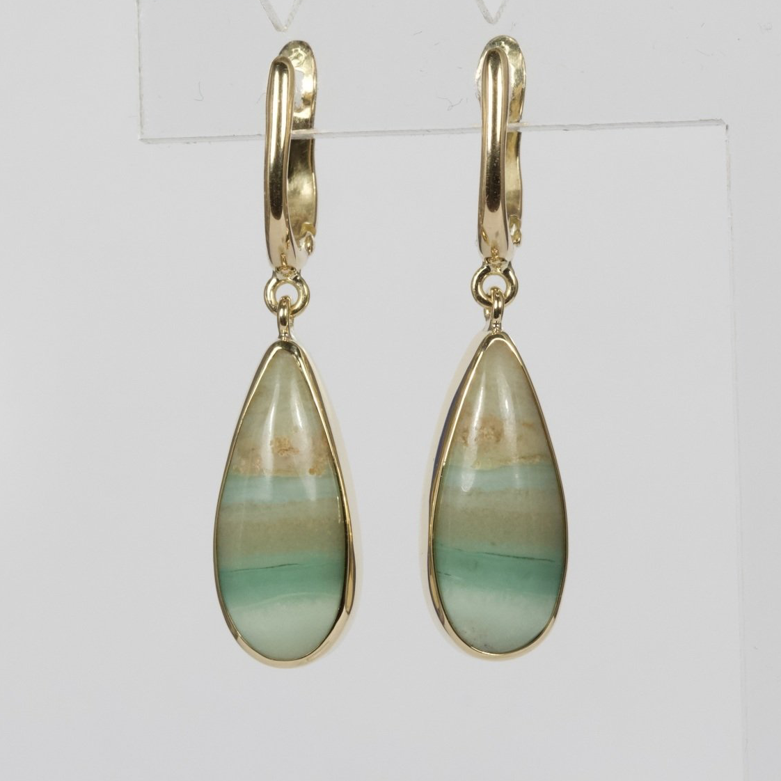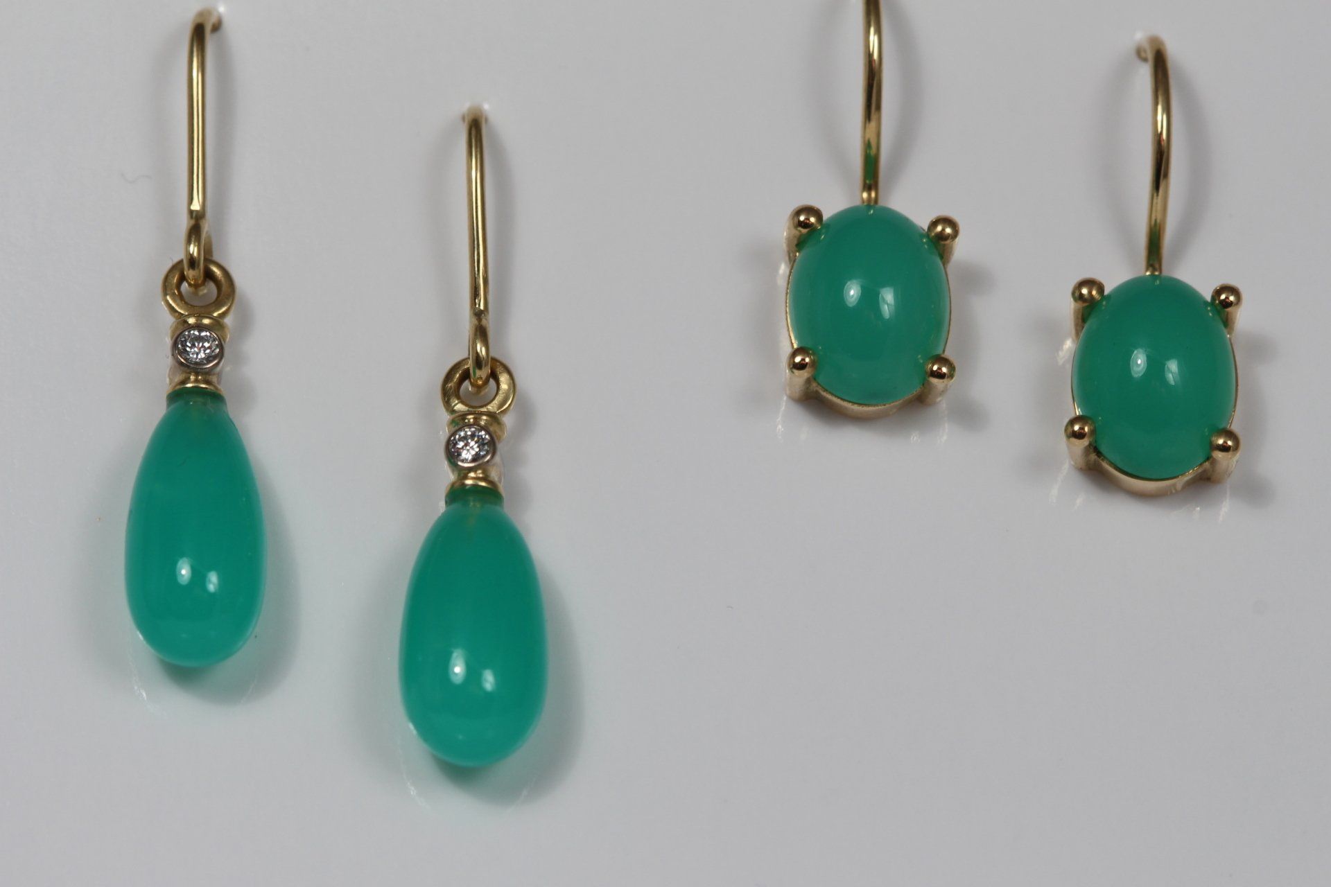 Oorhangers in 18 krt geelgoud met chrysopraas in chaton met vier poten.