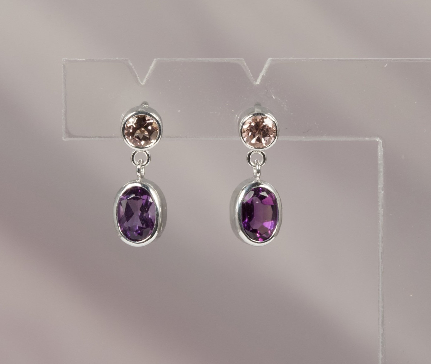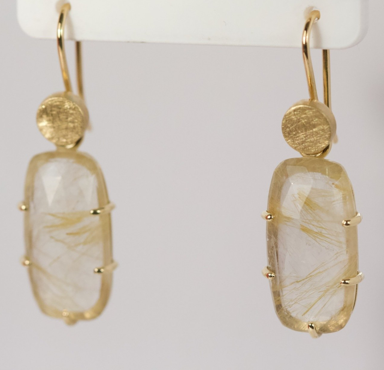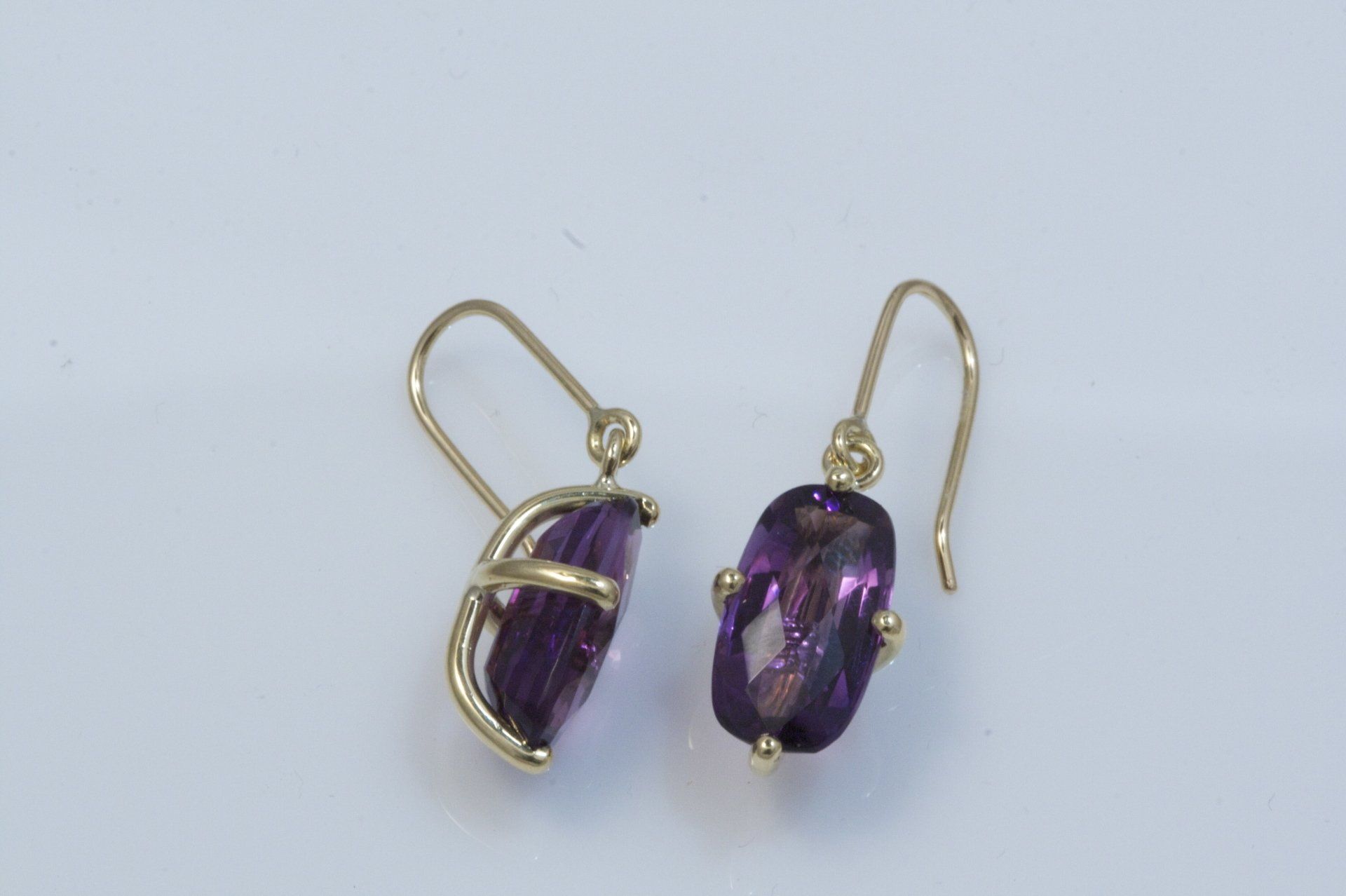Oorhangers in 18 krt geelgoud met schaakbord antiek geslepen amethyst in chaton