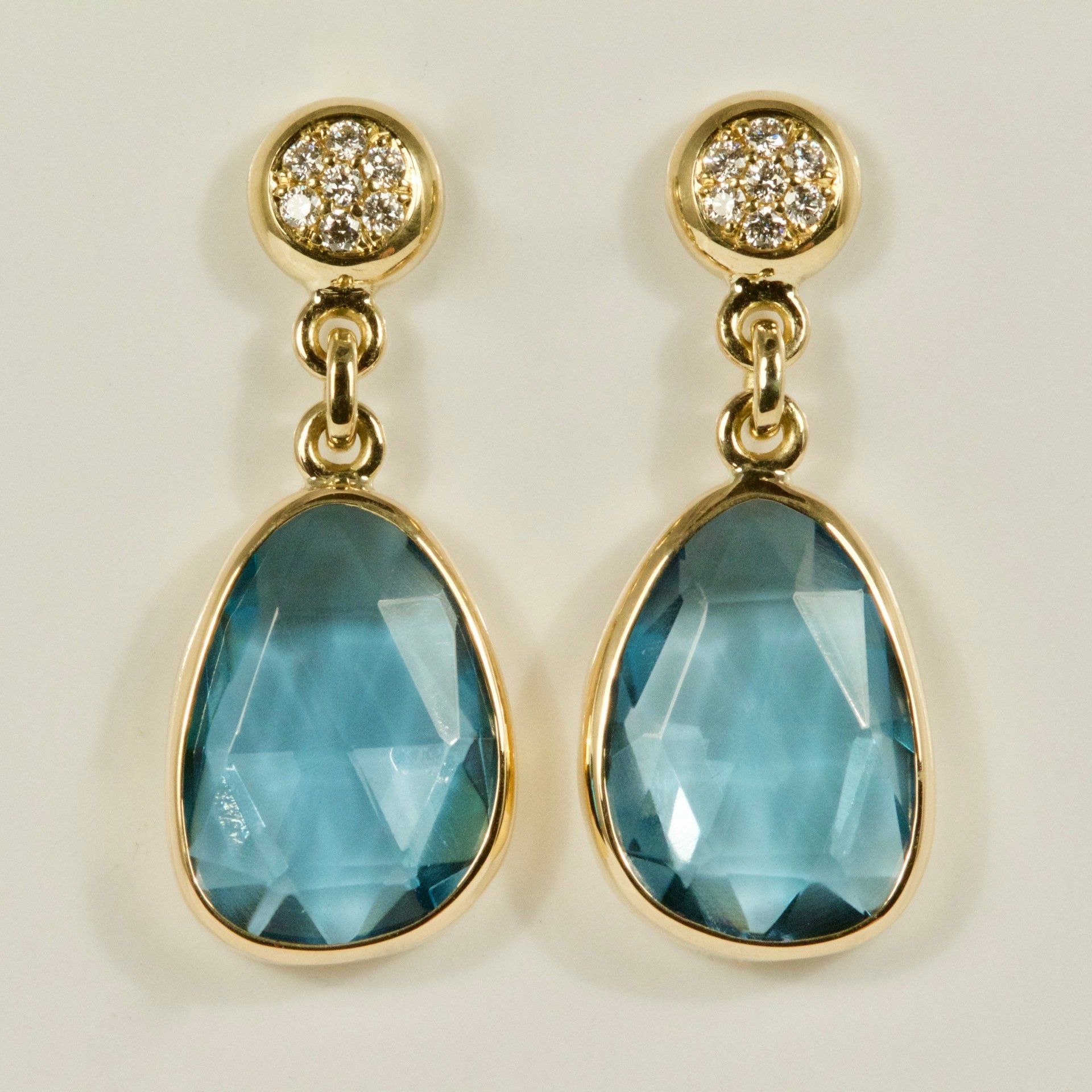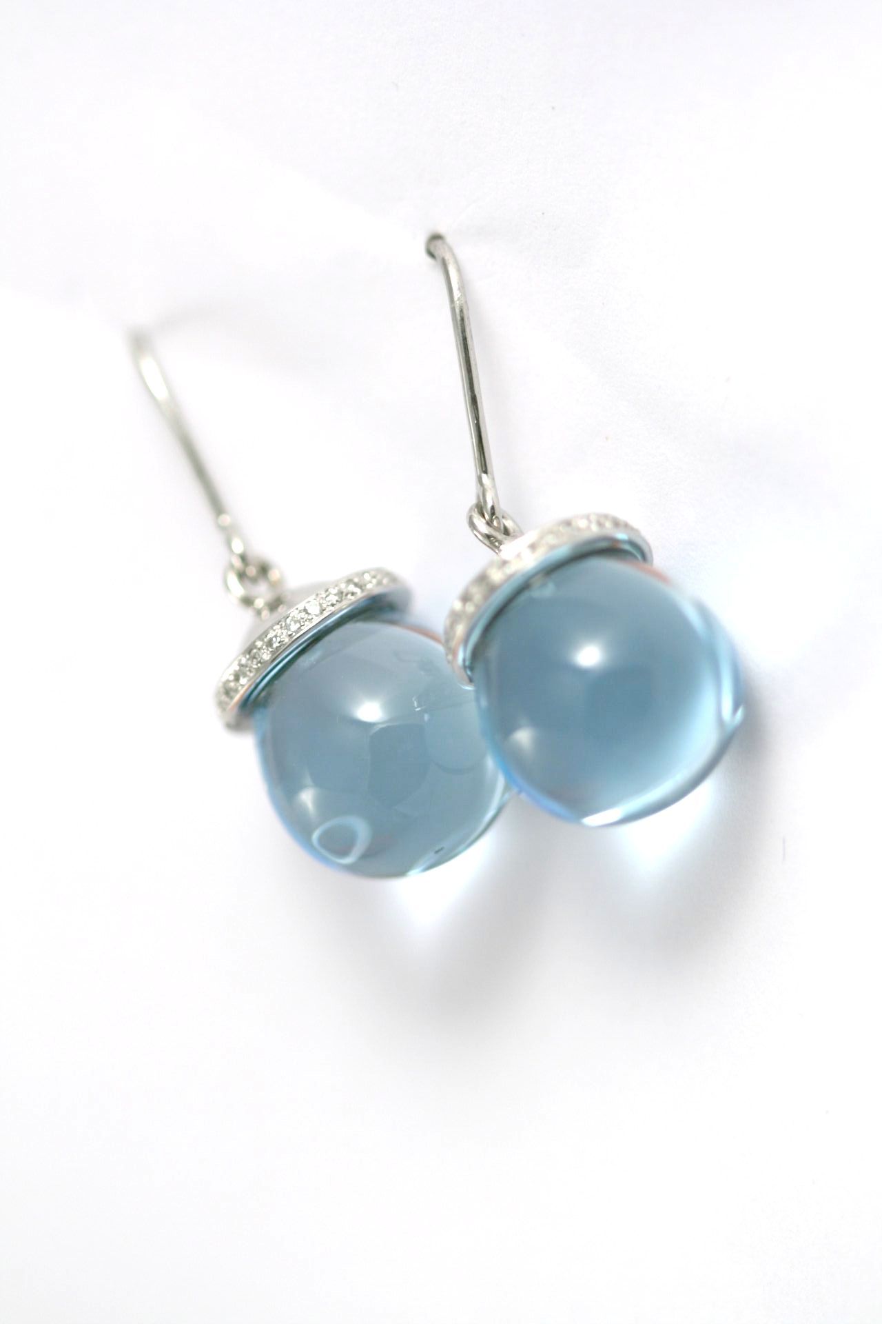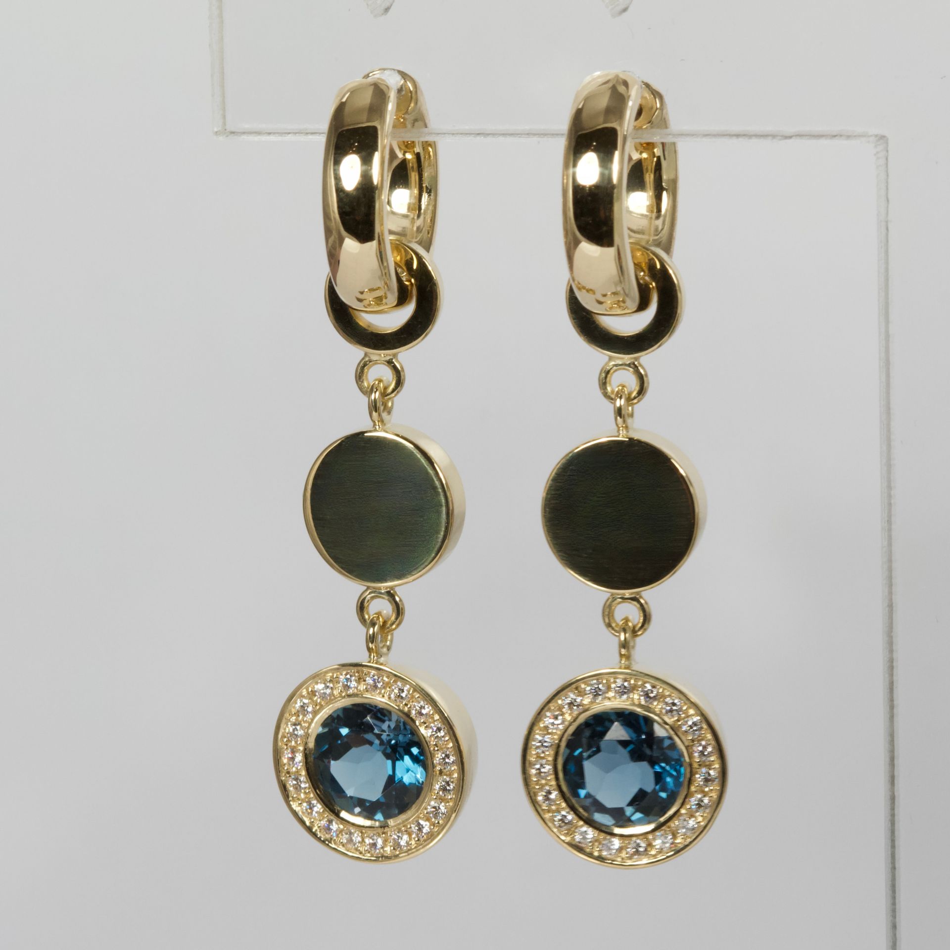 Oorhangers in 18 krt geelgoud met blauwe topaas Swiss met brillanten in witgouden zetkasten