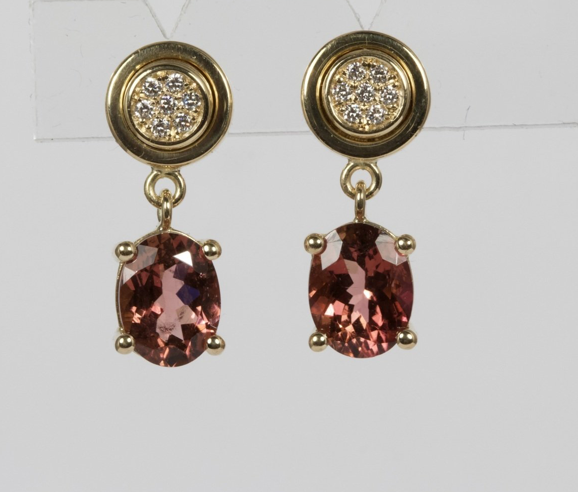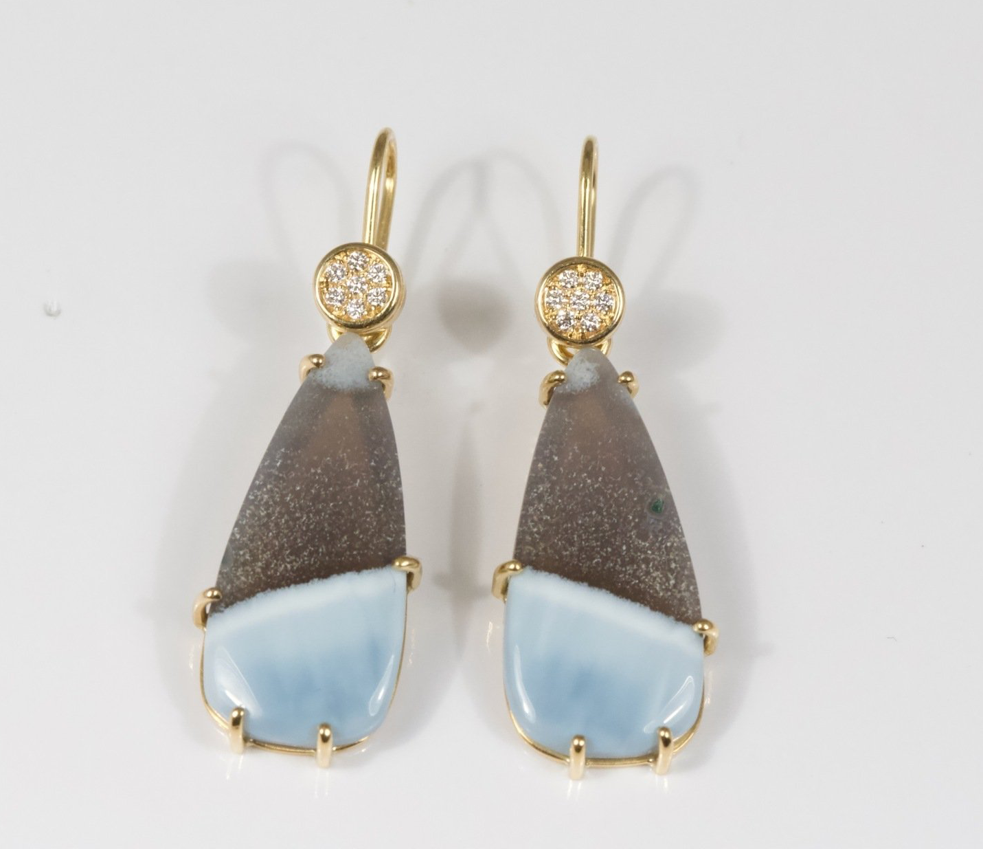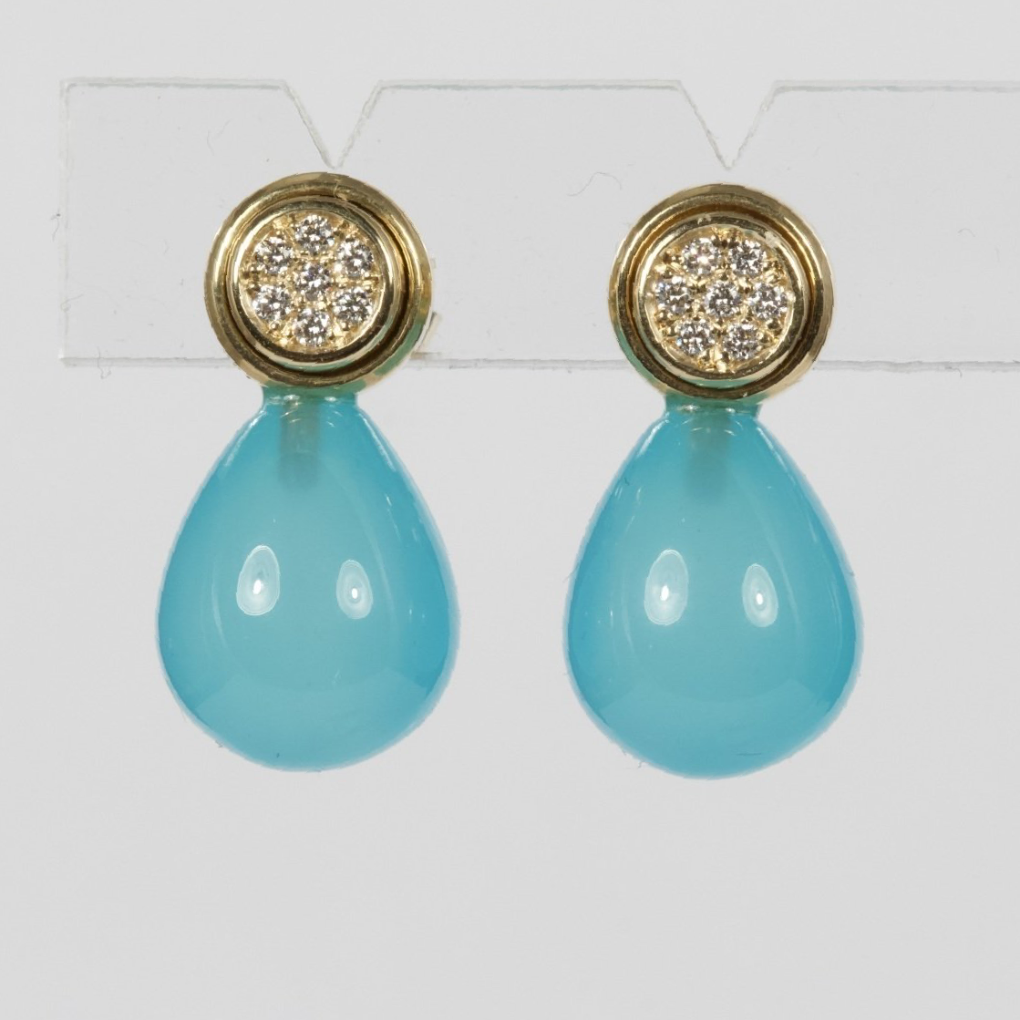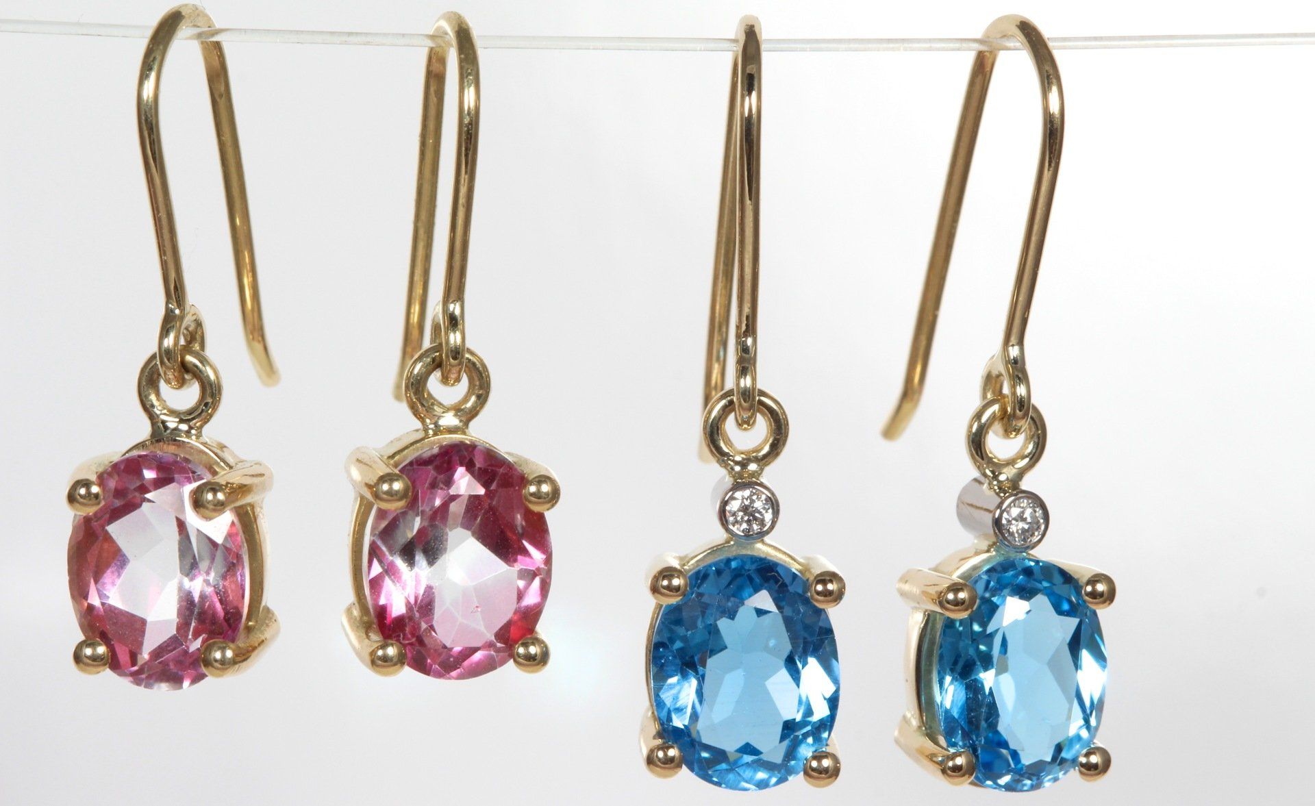 Oorhangers in 18 krt geelgoud met blauwe topaas Swiss met brillanten in witgouden zetkasten
